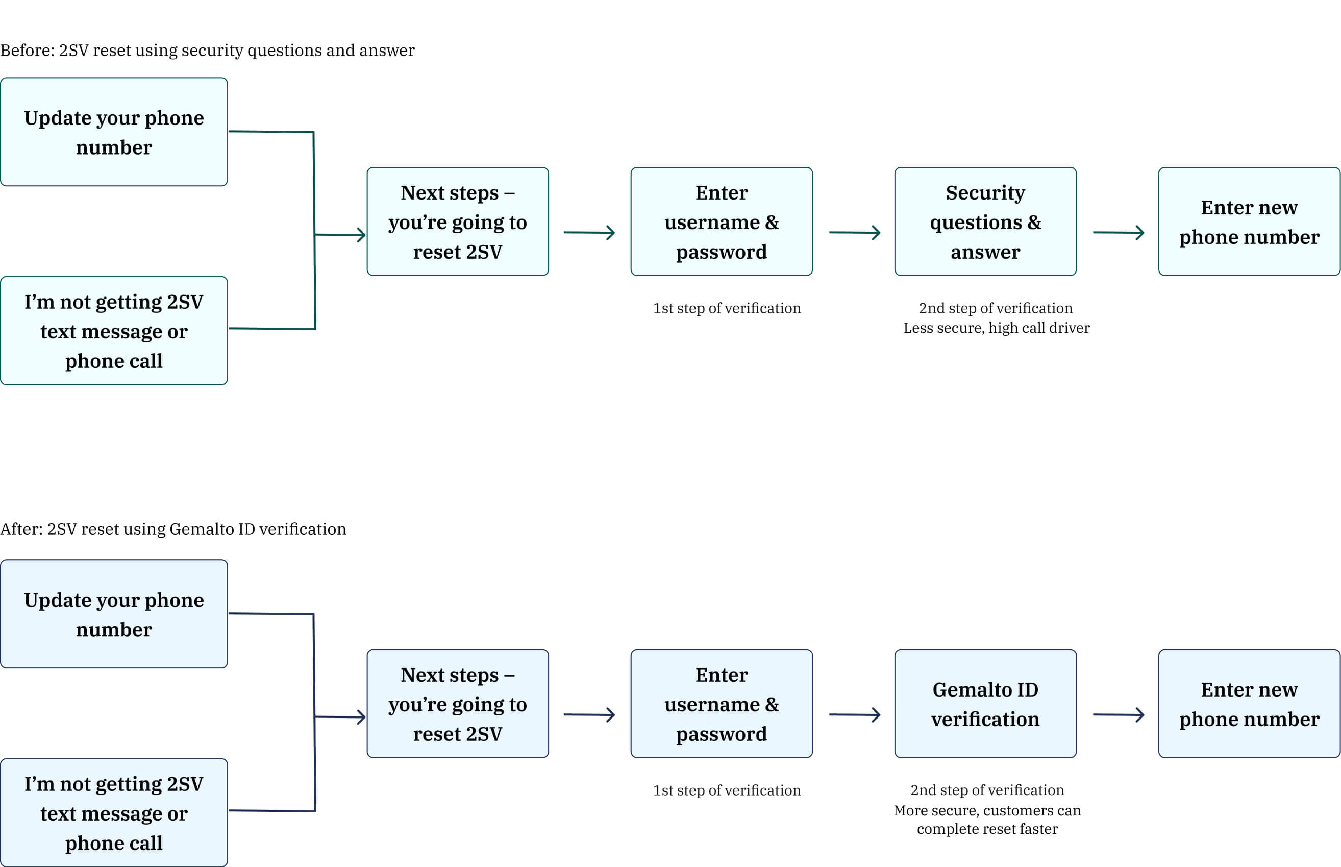I mapped the existing flow and highlighted friction points and feedback from the heuristic review. I created a flow diagram to understand how Gemalto will integrate into 2SV reset flow.